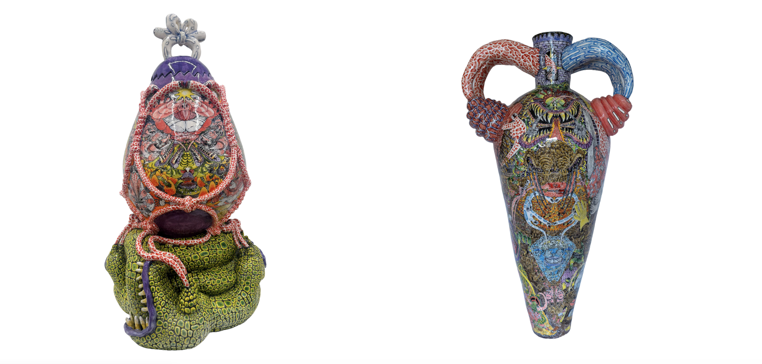 “Ivester Contemporary is pleased to present Flat Earth, a solo exhibition of new ceramic vessels by Charlie Hyman and the artist’s first with the gallery. Flat Earth brings together a group of hand-built ceramic vessels covered in energetic, humorous drawings. Across their surfaces, naïve characters set out on ill-fated journeys through imagined worlds shaped by labor, hierarchy, ritual, and conspiracy. These systems promise meaning, identity, and belonging, yet ultimately fall short. The drawings unfold like maps, tracing each character’s decisions and their consequences across the surface of the vessel.”