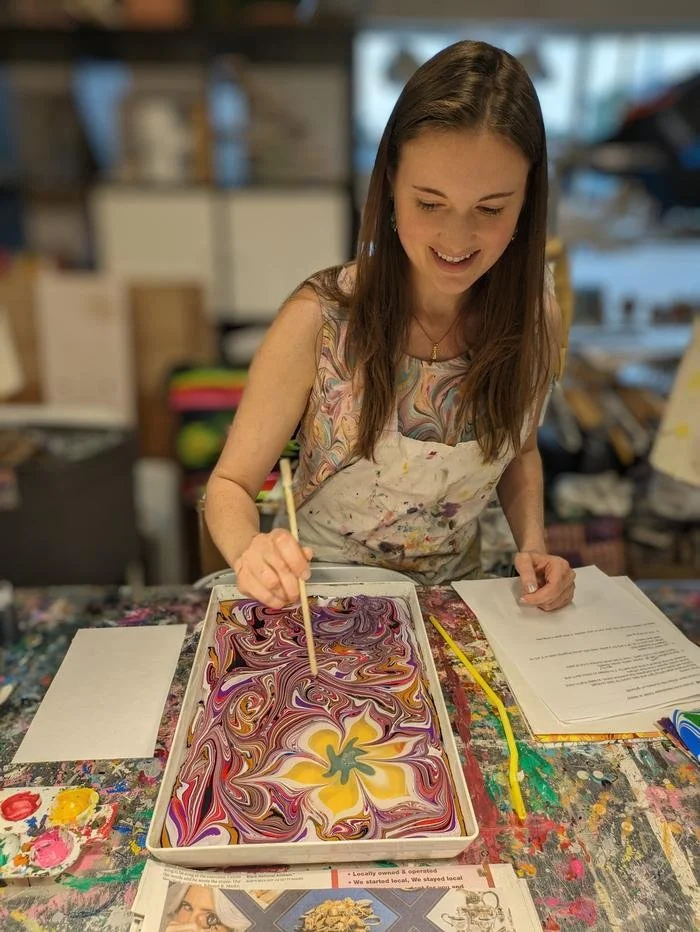 During this beginner-friendly 2-hour workshop, Leah McKnight will introduce you to the magic of paint marbling. First, you’ll learn techniques to create a variety of different patterns. Then you’ll be free to relax into the flow of marbling to create 5 pieces of marbled paper. Finally, you’ll use everything you learned to marble a fabric hand fan.
