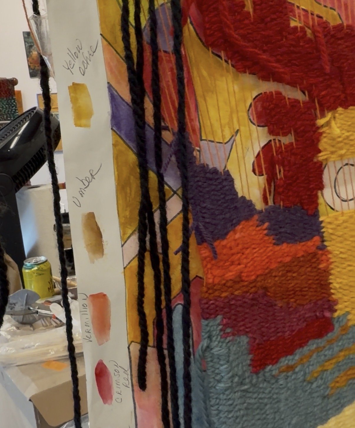 Cartoon weaving, a process that involves dyeing her own yarn, drawing a design on paper, painting that pattern and then translating that drawing into fiber.