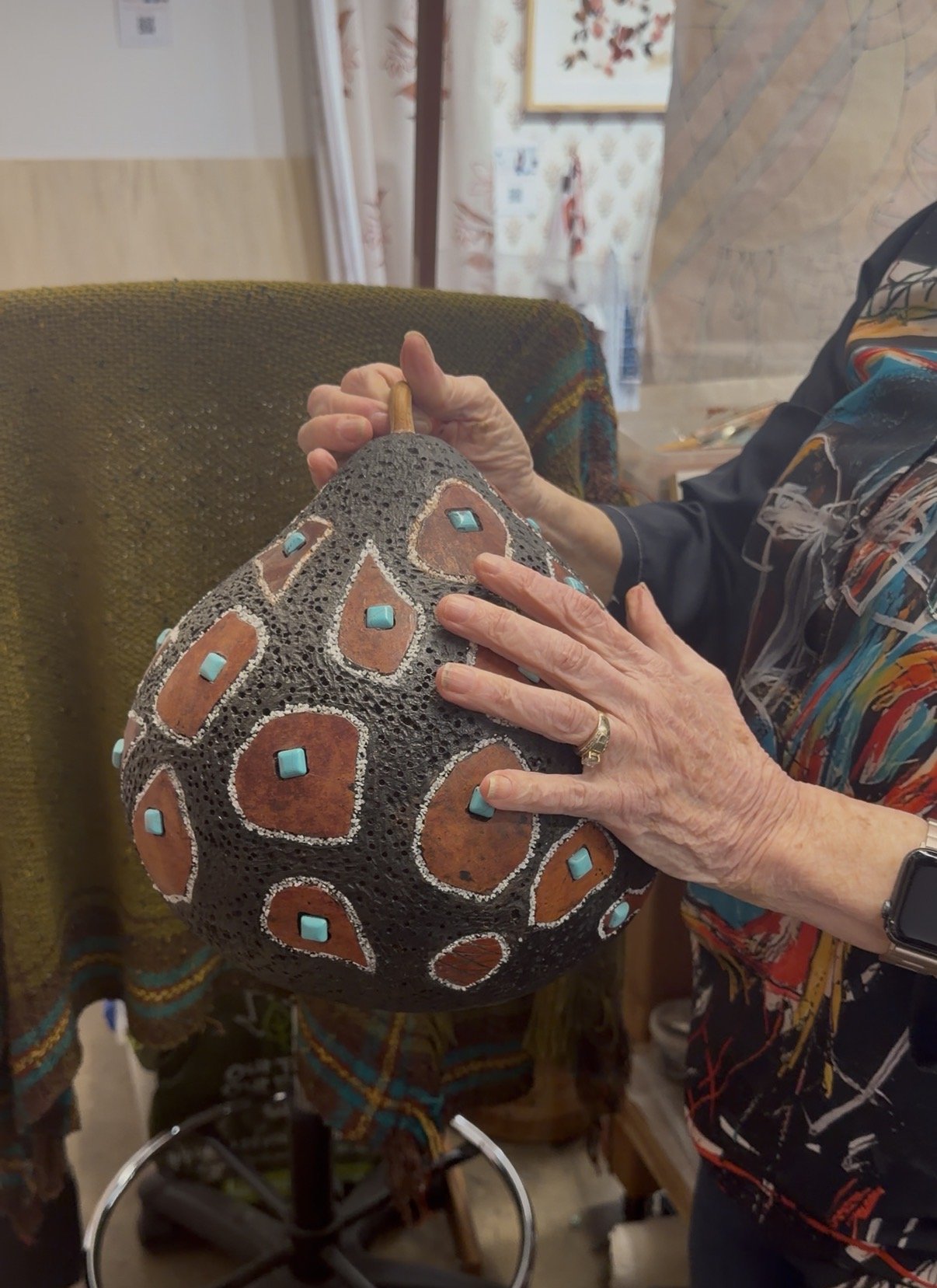 On the Walls: Dyed, carved gourd with turquoise embellishments